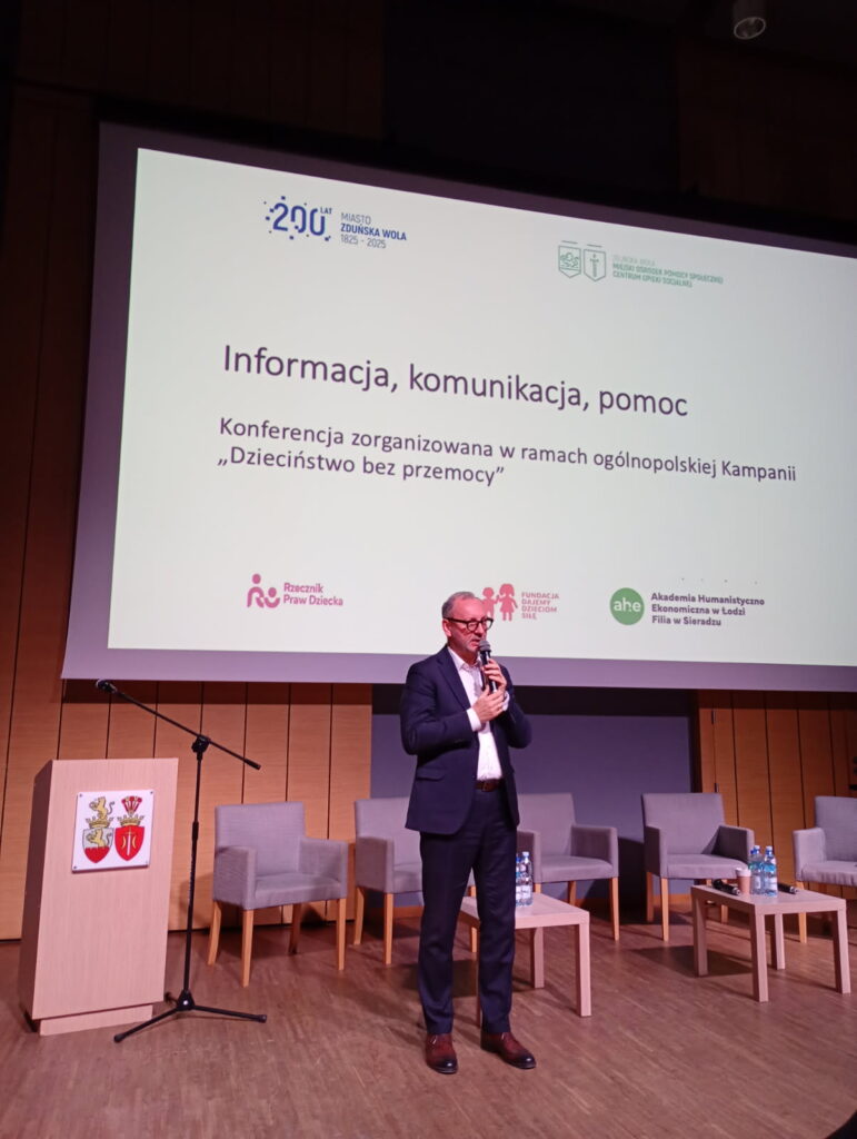 W dniu 19.11.2025 r. w Miejskim Domu Kultury Ratusz odbyła się Konferencja pt.: „Informacja, komunikacja, pomoc” organizowana na przez Miasto Zduńska Wola i Miejski Ośrodek Pomocy Społecznej Centrum Opieki Socjalnej w Zduńskiej Woli w partnerstwie z Akademią Humanistyczno-Ekonomiczną w Łodzi Filia w Sieradzu pod Patronatem Honorowym Rzecznika Praw Dziecka i Patronatem Fundacji Dajemy Dzieciom Siłę. Konferencja została zorganizowana jako inicjatywa edukacyjna, dzięki której wzmocni się współpraca interdyscyplinarna na rzecz przeciwdziałania przemocy wobec dzieci. Celem konferencji jest sprzeciw wobec krzywdzenia dzieci w Polsce i promocja skutecznych sposobów komunikacji w celu zapobiegania przemocy wobec dzieci.