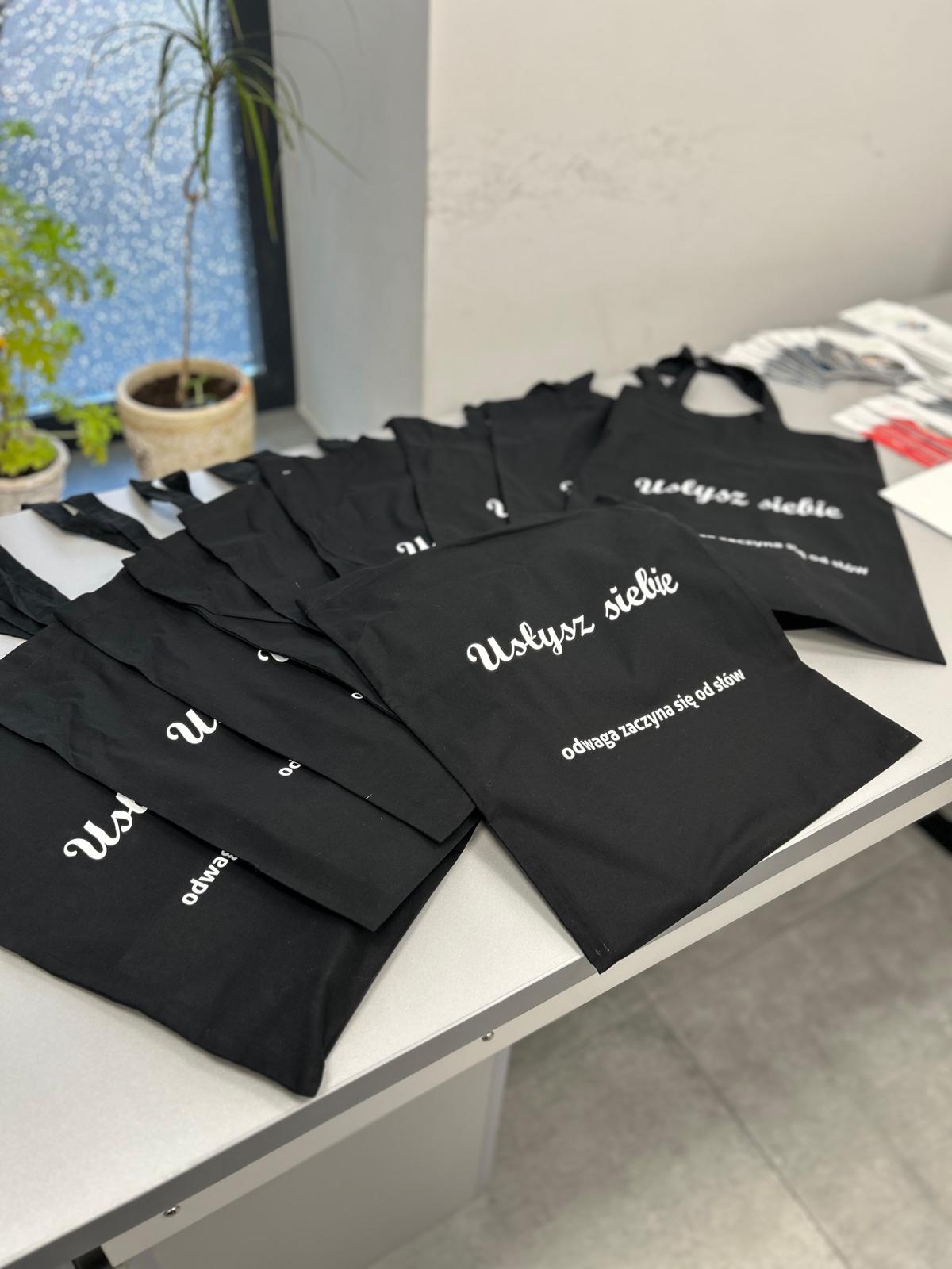 Zdjęcie przestawia torby bawełniane przeznaczone dla wszystkich uczestniczek projektu socjalnego z logo „Usłysz Siebie – odwaga zaczyna się od słów”