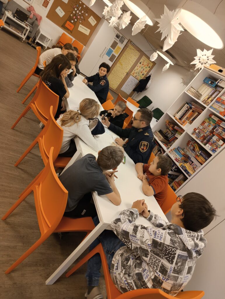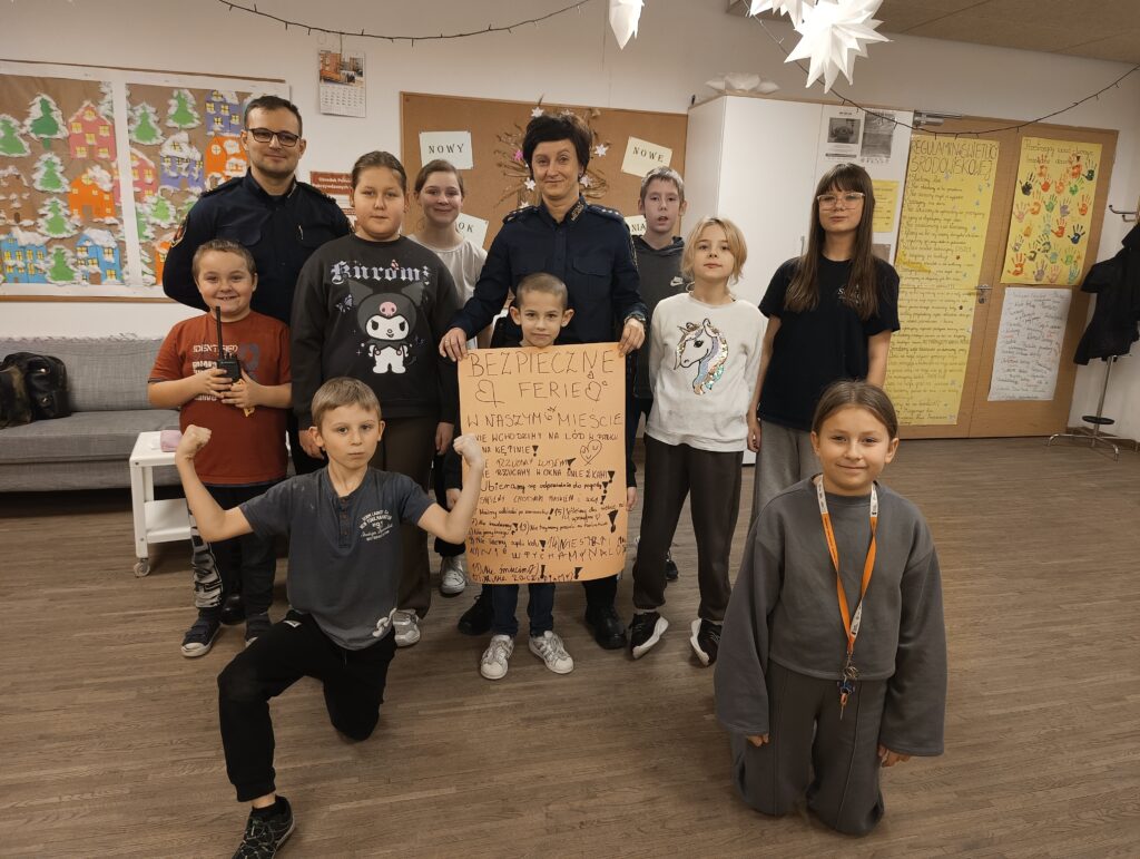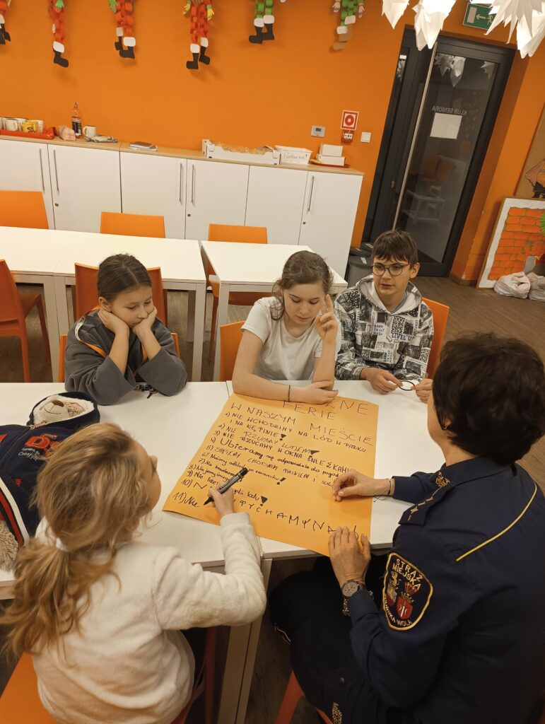 W ramach przygotowań do zimowego wypoczynku w Świetlicy środowiskowej odbyło się spotkanie z funkcjonariuszami Straży Miejskiej, którzy przeprowadzili zajęcia edukacyjne pod hasłem „Bezpieczne ferie w naszym mieście”. W trakcie spotkania, wychowankowie aktywnie uczestniczyli w rozmowach dotyczących bezpiecznego zachowania w czasie ferii zimowych. Wspólnie wykonali plakat przedstawiający najważniejsze zasady bezpieczeństwa na świeżym powietrzu.